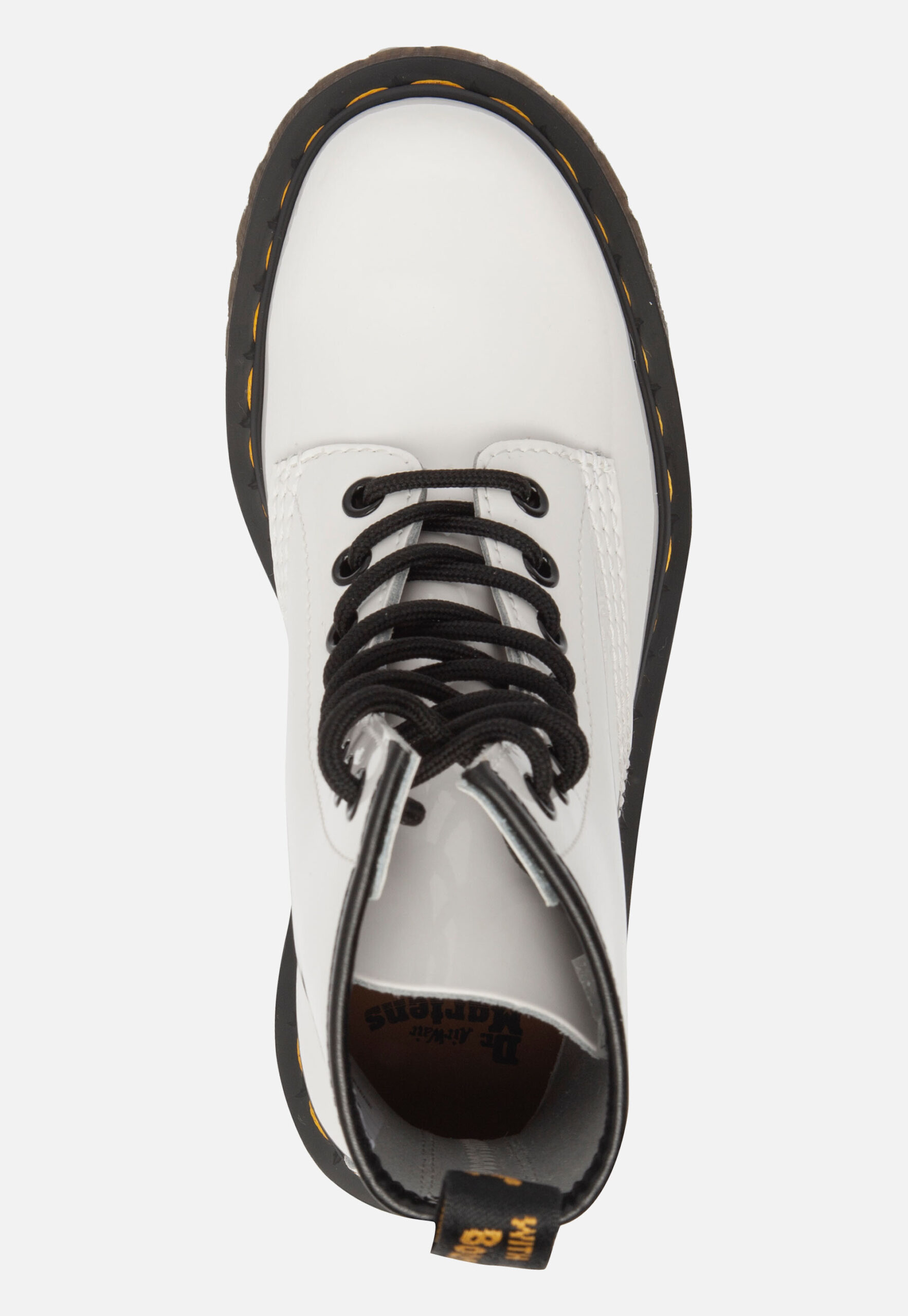 Deze Dr. Martens8 Eye veterboots met witte lak coating maken jouw outfit helemaal af! De boots zijn gemaakt van leer, net als de voering en comfortabele binnenzool. Ter decoratie zijn verschillende sierstiksels aangebracht. De boots zijn voorzien van de welbekende gele stiksels aan de rand van de zool en het aantreklusje met gele details. Door middel van een veter in combinatie met het aantreklusje aan de achterkant zijn de veterboots gemakkelijk aan en uit te doen. De profielzool is gemaakt van rubber en heeft een dikte van 3 centimeter. Het voetbed van deze witte Dr. Martens 8 Eye veterboots is niet uitneembaar.