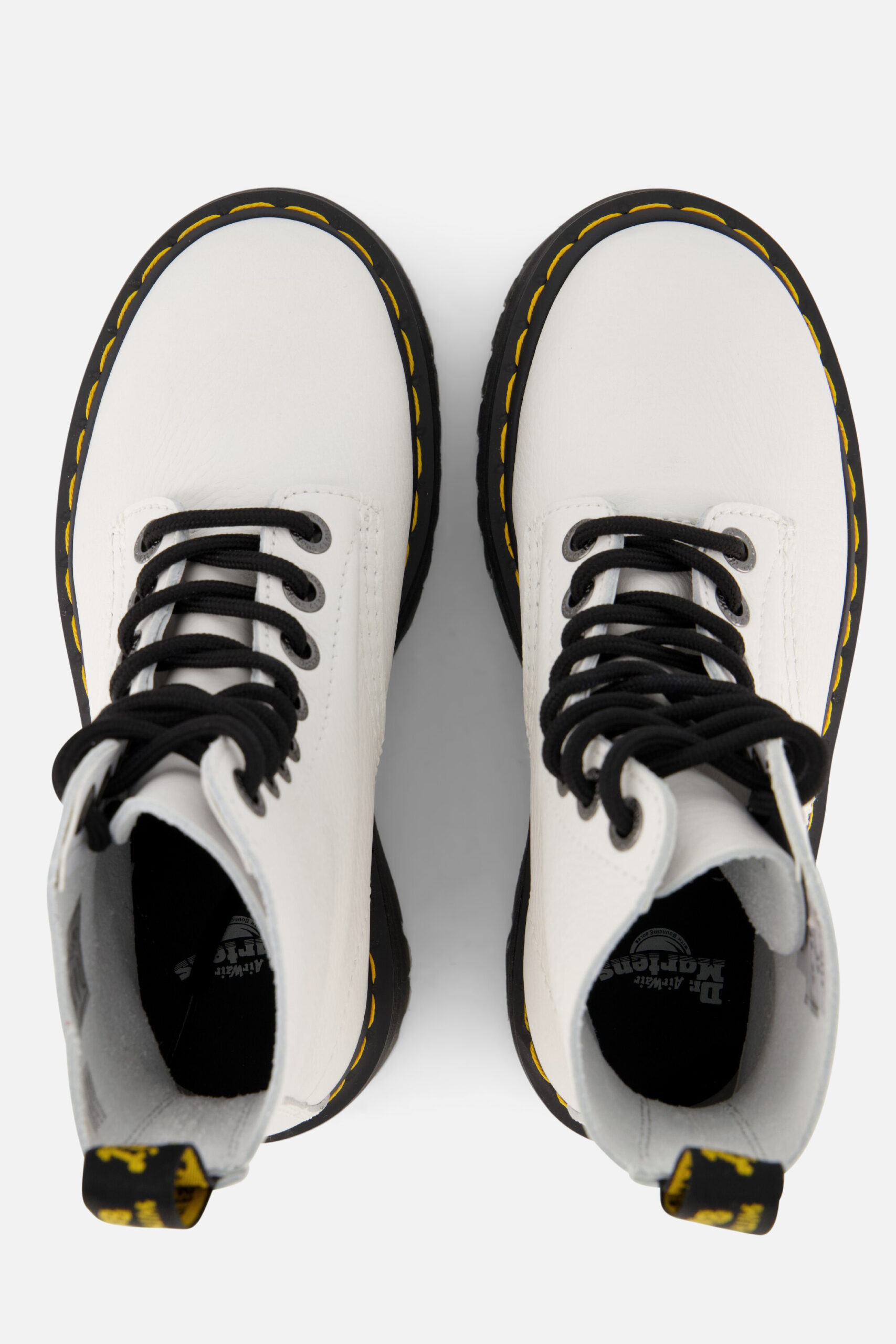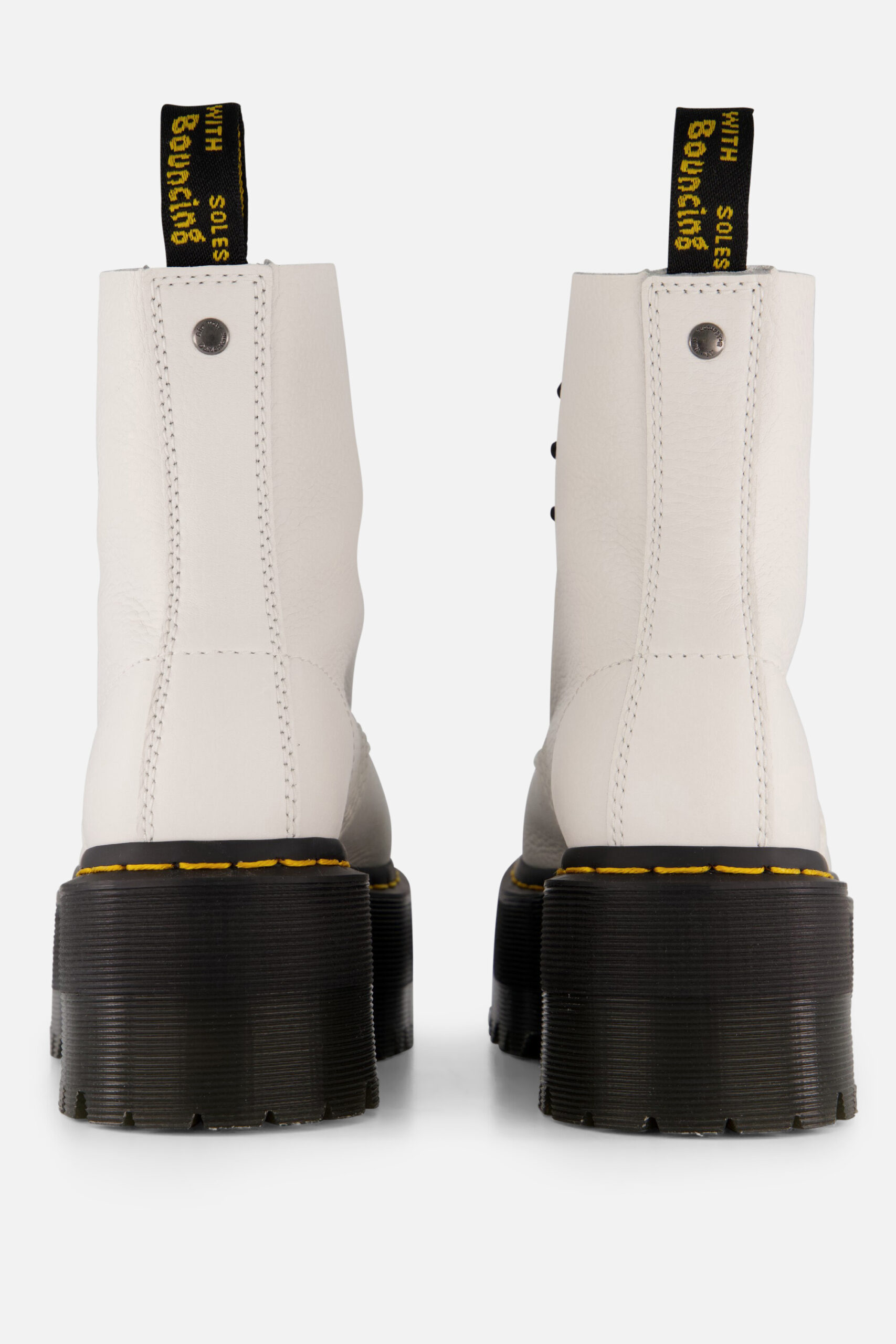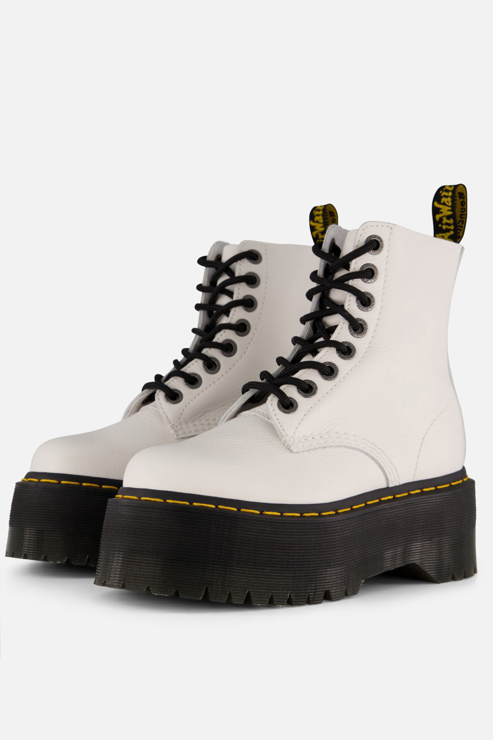 Deze Dr. Martens Quad Retro Max veterboots zijn populaire en tijdloze boots. Deze boots zijn uitgevoerd in glad wit leer. De laarzen zijn voorzien van de kenmerkende gele stiksels, lus op de achterkant en acht veterogen aan beide kanten. De comfortabele Dr. Martens zool met luchtkussen, die olie- en vetbestendig is, biedt een goede slipweerstand. De zwarte rubberen platformzolen van deze boots zijn 4 centimeter hoog. Je moet de schoenen even inlopen, maar daarna zal je jarenlang plezier hebben van deze witte Dr. Martens veterboots.