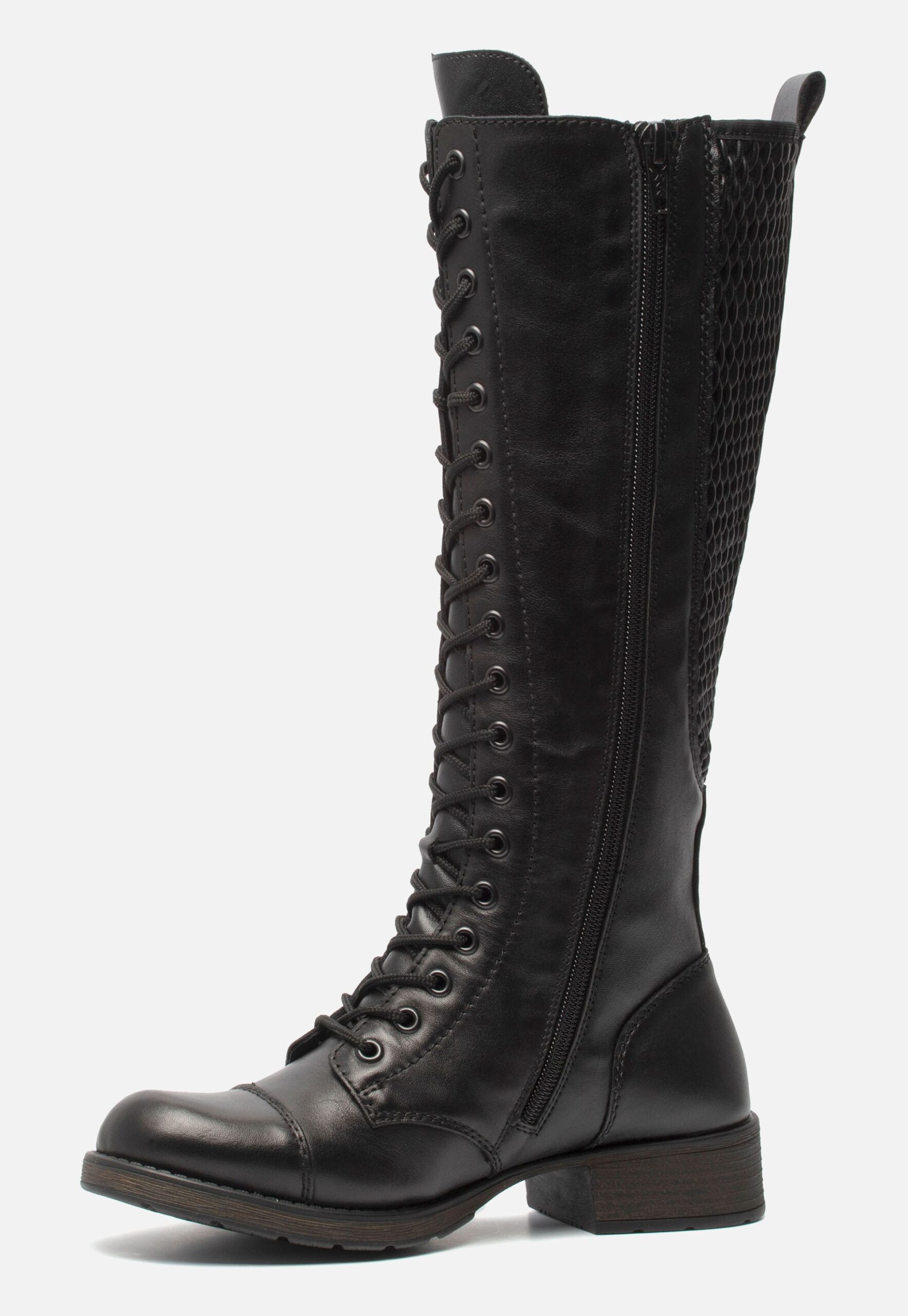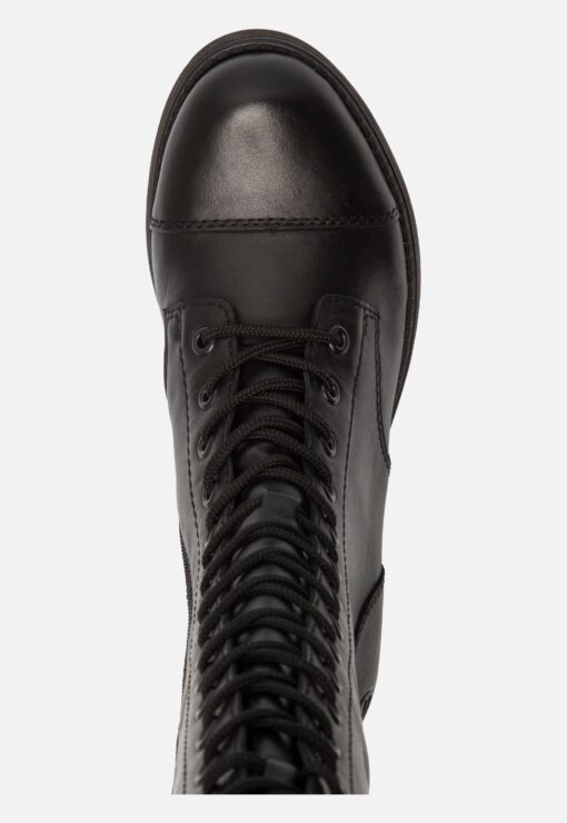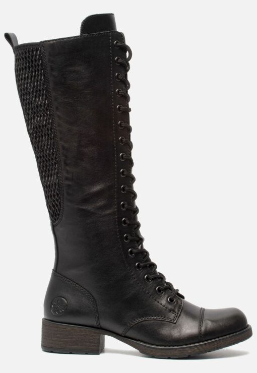 Deze zwarte Rieker hoge laarzen zijn gemaakt van textiel. De voering is ook van textiel en de comfortabele binnenzool is gemaakt van synthetisch materiaal. Ter decoratie zijn verschillende inzetten aangebracht. Door middel van een rits in combinatie met een veter en het aantreklusje aan de achterkant kan je de laars gemakkelijk aan en uit doen. Door de elastische inzet sluit de laars goed aan. De schoen is uitgevoerd in een F-leest. Hierdoor zijn ze geschikt voor smallere voeten. De rubberen zool heeft een lage hak van 3 centimeter. Het voetbed van deze zwarte Rieker hoge laarzen is niet uitneembaar.