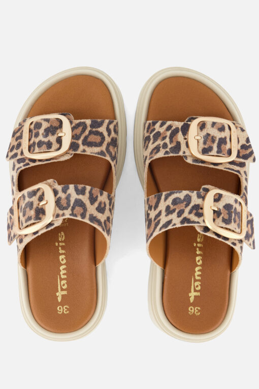 Deze Tamaris Leopard slippers zijn volledig gemaakt van leer en synthetisch materiaal. Voorzien van dubbele banden met handige gespsluitingen. Het voorgevormd voetbed met touch-it zorgt voor comfort en de zool is gemaakt van rubber.