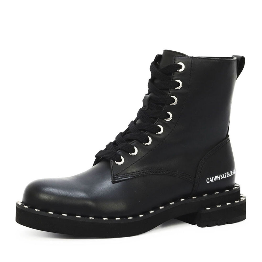 Zwarte biker boots voor dames van het Amerikaanse modehuis Calvin Klein. Wat direct opvalt aan deze stoere dames boots, zijn de zilverkleurige studs langs de lichtgewicht rubberen zool en het merklogo aan de zijkant van de schacht. Het laarsje is comfortabel gevoerd en voorzien van een handige rits zodat je de boots gemakkelijk kunt aantrekken.