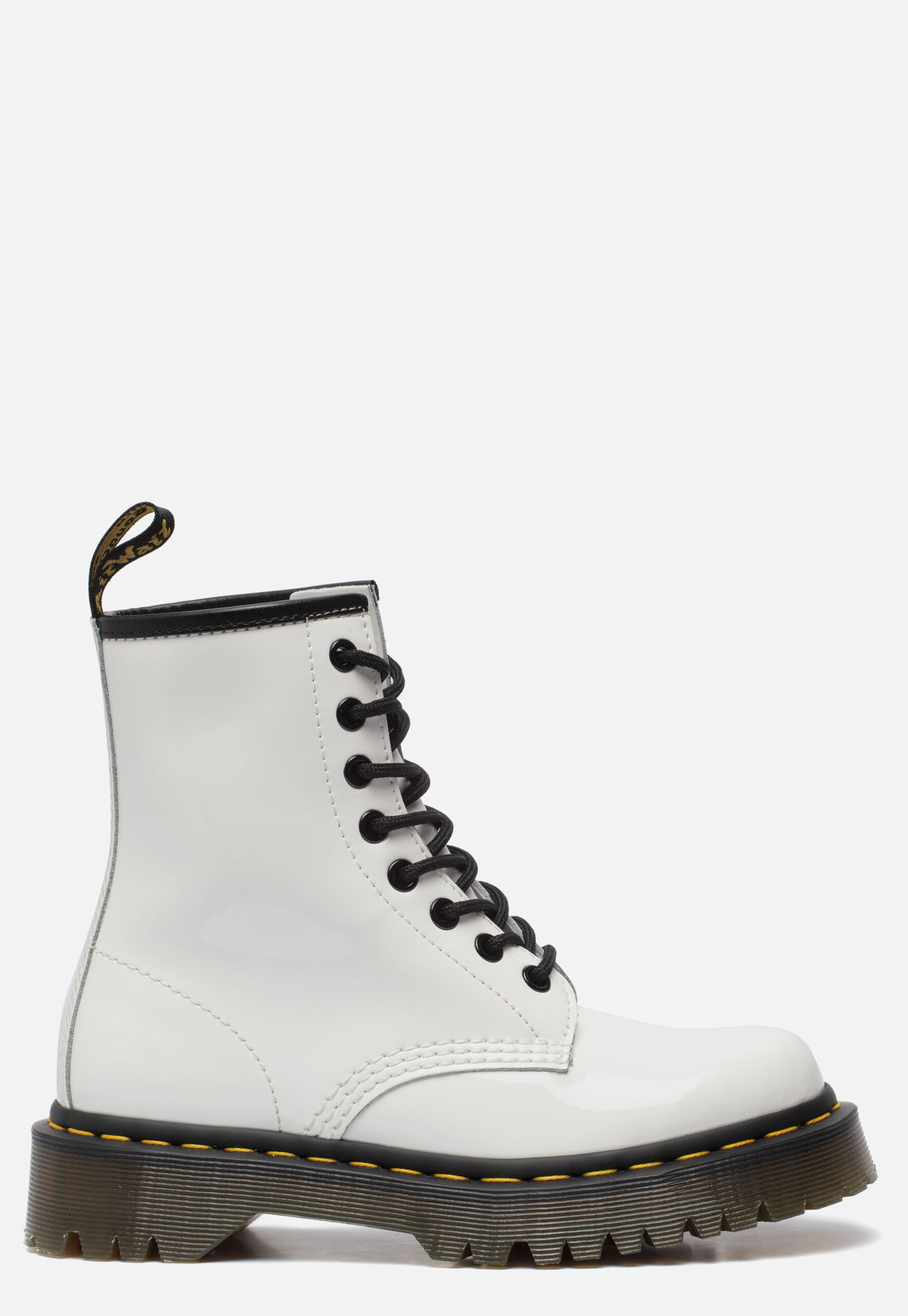 Deze Dr. Martens8 Eye veterboots met witte lak coating maken jouw outfit helemaal af! De boots zijn gemaakt van leer, net als de voering en comfortabele binnenzool. Ter decoratie zijn verschillende sierstiksels aangebracht. De boots zijn voorzien van de welbekende gele stiksels aan de rand van de zool en het aantreklusje met gele details. Door middel van een veter in combinatie met het aantreklusje aan de achterkant zijn de veterboots gemakkelijk aan en uit te doen. De profielzool is gemaakt van rubber en heeft een dikte van 3 centimeter. Het voetbed van deze witte Dr. Martens 8 Eye veterboots is niet uitneembaar.