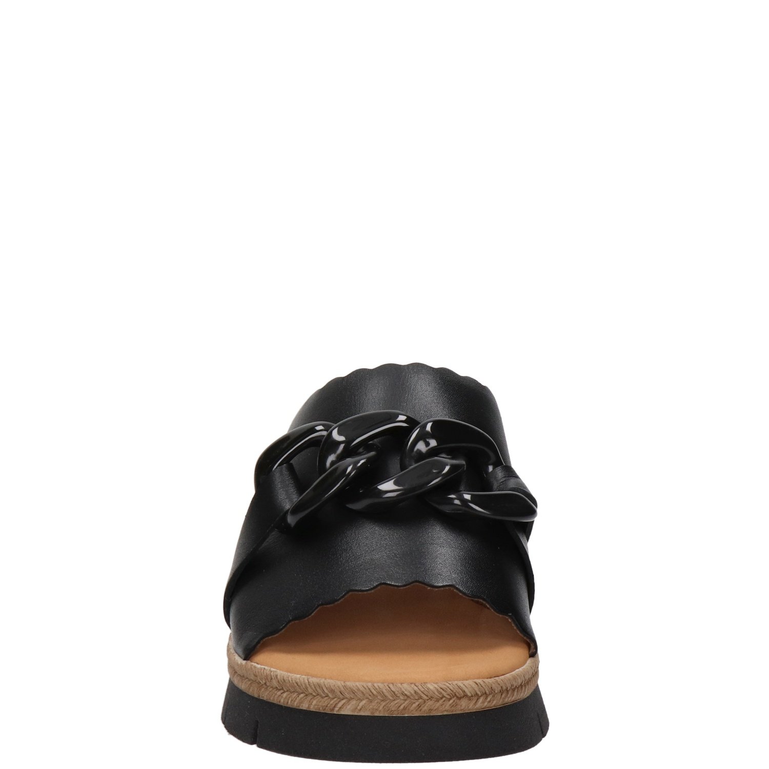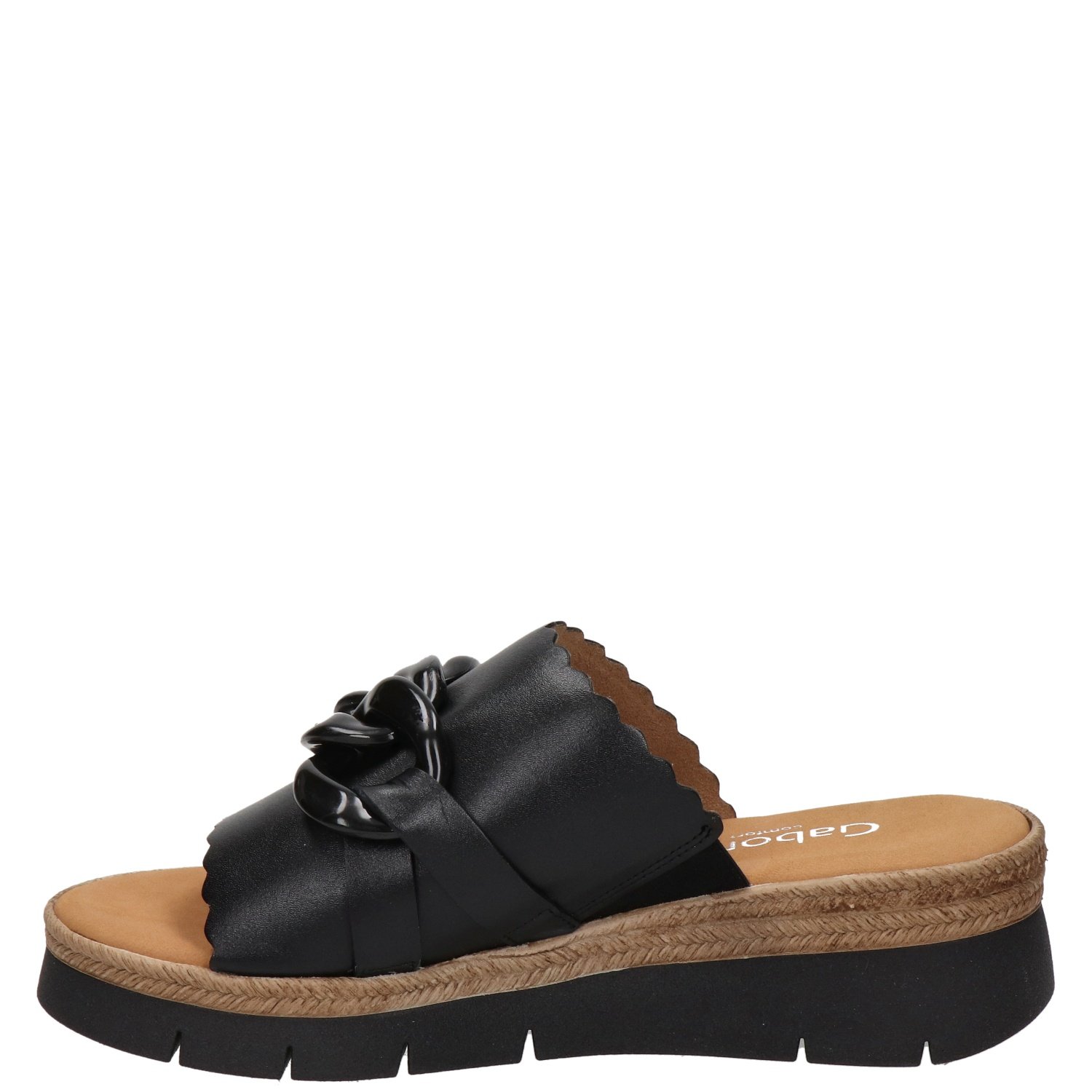 Gabor Nappa dames slipper Een zwarte chain geeft deze slipper zijn trendy look! De buitenkant van de band van de slipper is van glad leer. De binnenkant van de band is afgewerkt met suede. Beschikt over een comfortabele binnenzool van foam. Met een stevige zool gemaakt van rubber.