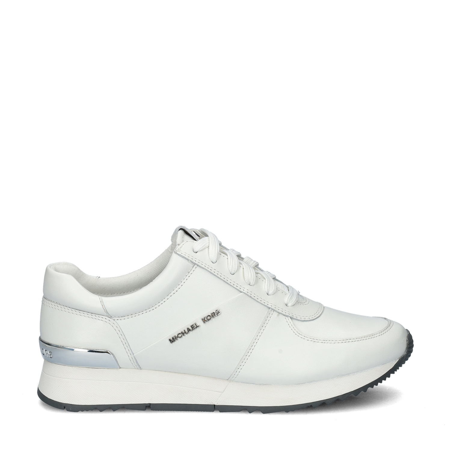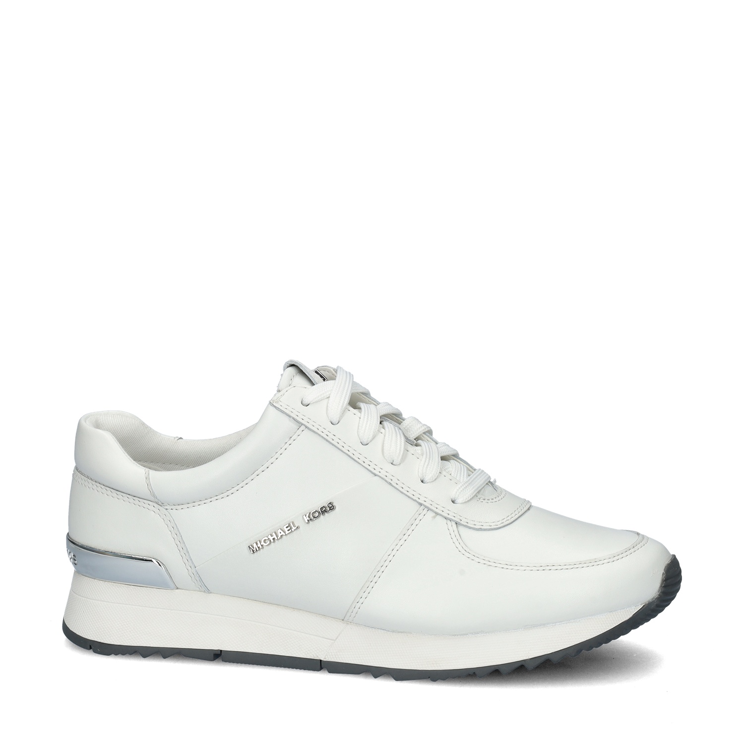Michael Kors Allie Trainer dames sneaker De nieuwe toevoeging aan onze collectie: Michael Kors. Loop erbij als een echte fashionista met deze strakke sneakers van de bekende mode-ontwerper. Uitgevoerd in leer met zilverkleurige details. Gevoerd met canvas wat de voeten koel houdt. De licht gewatteerde enkelkraag biedt meer comfort. Voorzien van een foam-voetbed wat zachte demping geeft tijdens het lopen. Afgewerkt met een rubberen loopzool die gripvast is waardoor je ook op gladdere ondergronden stevig staat.