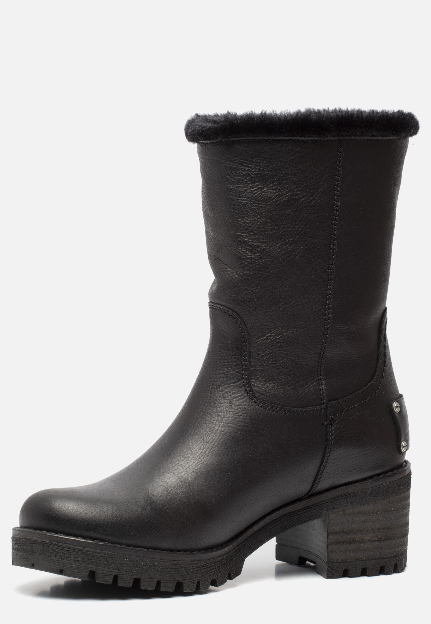 Zwarte Panama Jack Piola B36 boots, gemaakt van leer. De voering en comfortabele binnenzool zijn gemaakt van zacht imitatiebont. Dit zorgt voor warme voeten gedurende de hele winter! Ter decoratie zijn de laarzen voorzien van stiksels, inzetten en een merkopdruk. De rubberen zool heeft een hoogte van 2 centimeter en een hak van 6 centimeter. Het voetbed van de Panama Jack Piola B36 laarzen is niet uitneembaar.